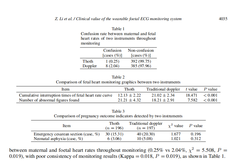 该研究将索思胎心监测产品与传统多普勒胎儿心电监测系统作对比得出了使用索思胎心监测产品可以在降低心电信号混淆率,获得更准确的数据采集,更低的临床错误判断率,同时在减少医务人员的工作量,以及提高孕产妇分娩时的舒适度方面,都体现出了明显的优势。另外,在两组产品的临床实验对照中,索思产品急诊剖宫产率和新生儿窒息率上也低于多普勒产品,这可能是由于心电信号的稳定性不同,和母体心率的干扰多少等问题所导致。